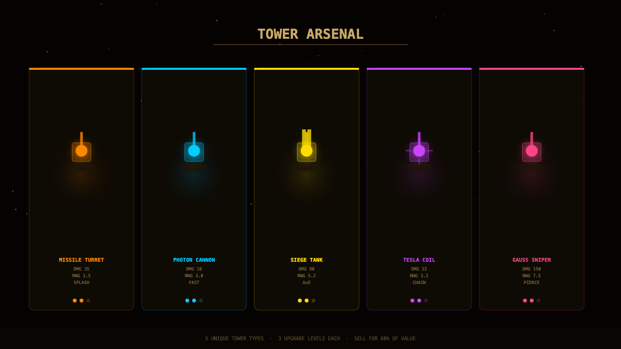 - 5 tower types with 3 upgrade levels each